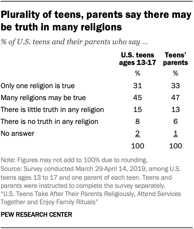 Teenagers tend to be open up to the possibility that there may be truth in multiple faiths and that people tin can be moral without believing in God. A plurality of teens (45%) express the belief that many religions may exist truthful, while 31% say that only 1 organized religion is truthful. Fewer teens say at that place is piffling or no truth in any religion.
